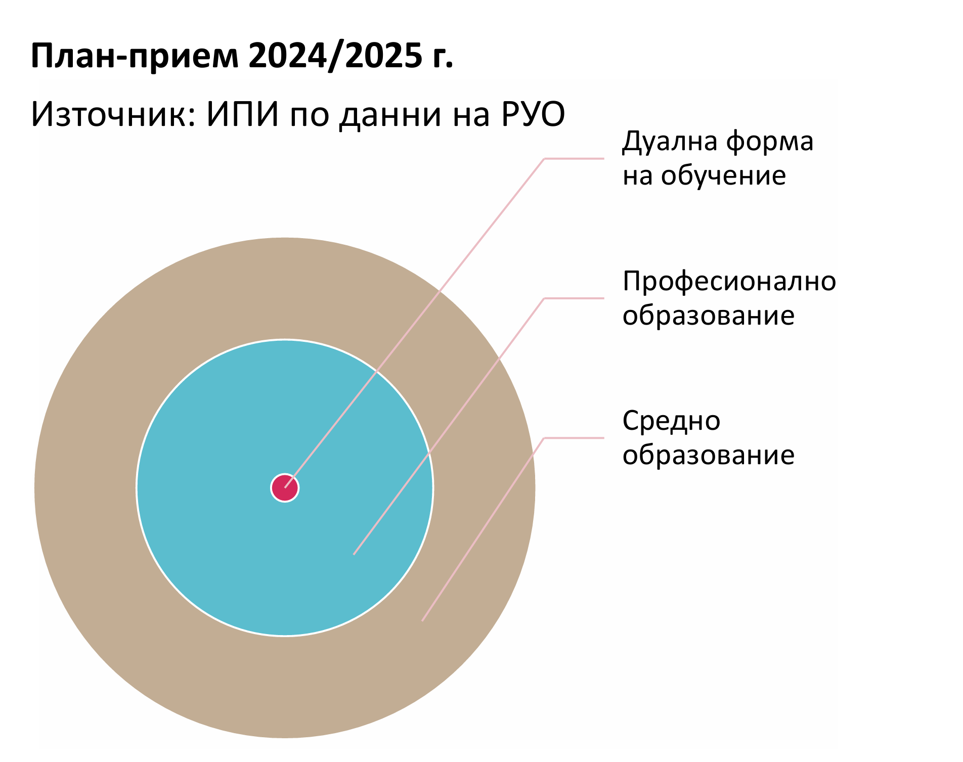 "Има огромен прием в средното образование - над 60 000 ученици всяка година, от който над 50% е професионалното образование, но учениците в професионалното образование, които учат в дуална форма са много малко - около 5% от всички или 9% от, онези избрали да учат в професионални училища", коментира Славова.