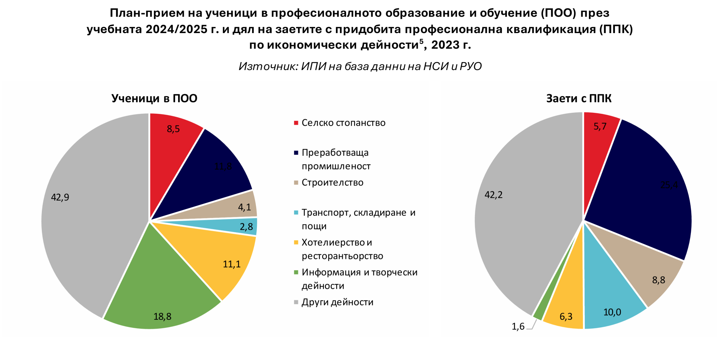 В "Преработваща промишленост" например делът на заетите с придобита професионална квалификация е най-голям - 25%. Същевременно приемът в 146-те специалности в сферата представлява 12% от целия план-прием в страната. Това са около 4 хиляди ученици, приети за обучение през настоящата учебна година.