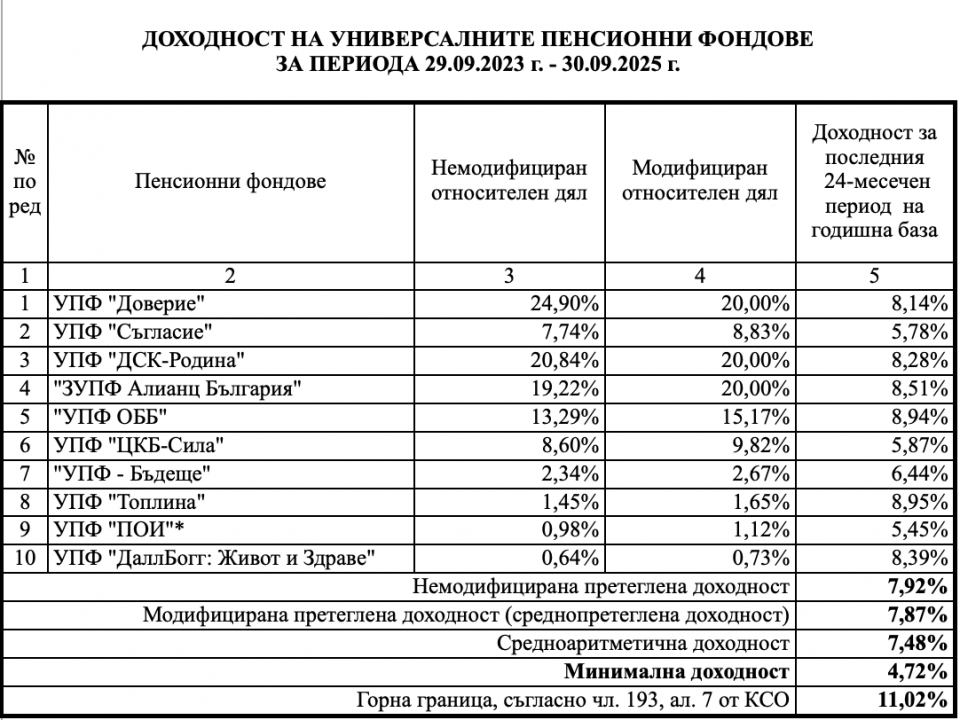 Два от универсалните фондове, където се осигуряват за втора пенсия родените след 1959 г., доближават дори 9% доходност - "Топлина" (8,95%) и УПФ ОББ (8,94%). "Алианц България" е с 8,51%, "ДаллБогг: Живот и Здраве" е с 8,39%, "ДСК-Родина" е с 8,28%, а "Доверие" - с 8,14%. "Съгласие" е с 5,78%, "ЦКБ-Сила" с 5,87%, "Бъдеще" - с 6,44%, а ПОИ - 5,45%.